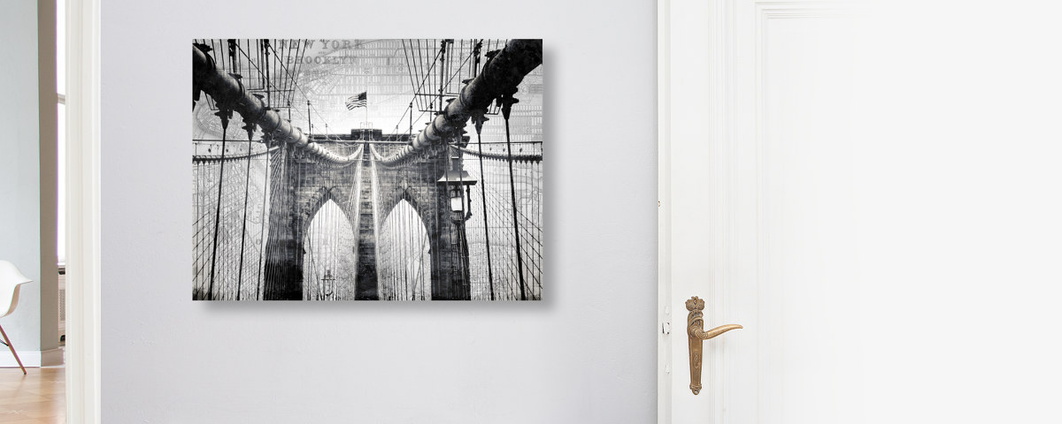 BROOKLYN BRIDGE ART auf Leinwand im Format Ihrer Wahl. Mit gespiegelten oder umgeschlagenem Rand bzw. der Randfarbe Ihrer Wahl. Mit 2,5 oder 3,8 cm starken Perfect Frame Rahmen.